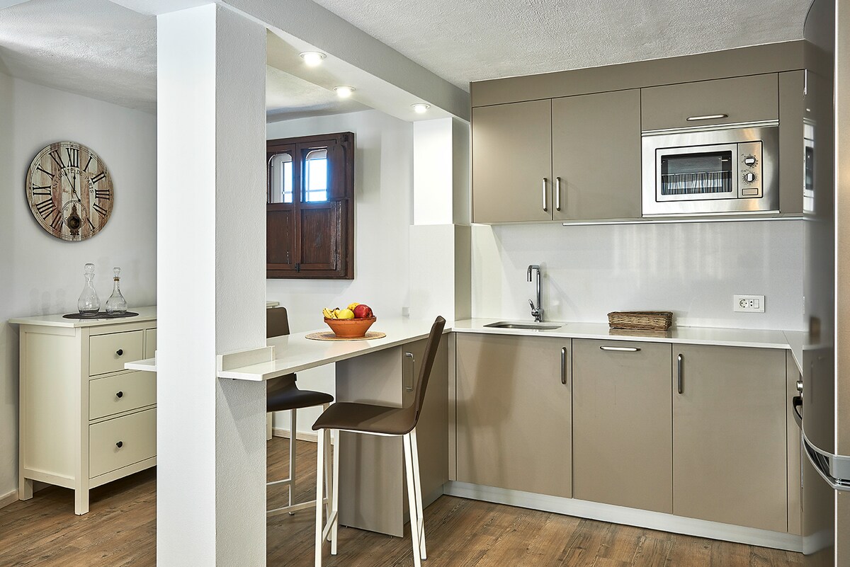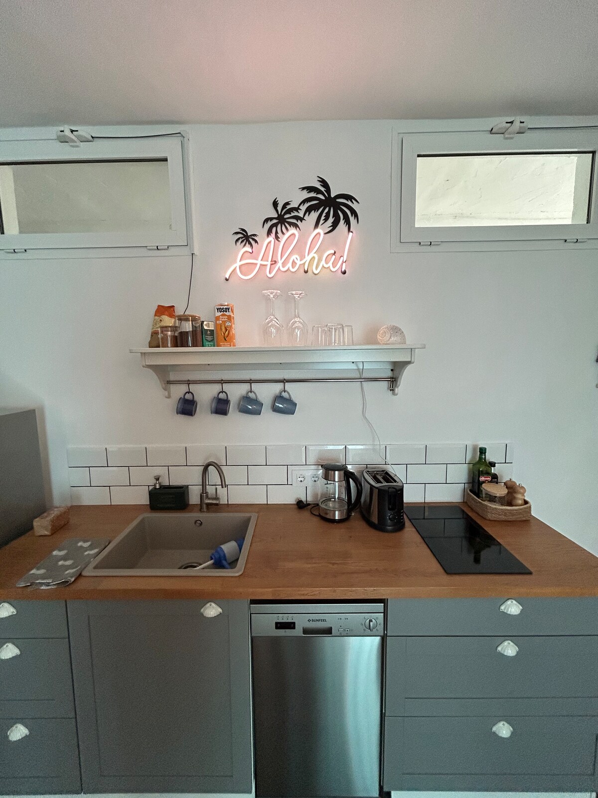 O apartamento praticamente cortado Aina Ohana (terra) oferece acesso direto ao terraço e é frequentemente reservado em conjunto com o Aina. No Havai, "Ohana" significa família – muitas vezes há uma casa de hóspedes para os visitantes. A casa de banho grande tem um chuveiro, gel de banho e sabonete. Uma cama queen size garante uma boa noite de sono. Concebido para 2 pessoas, com cozinha totalmente equipada e linhas claras, combinado com decoração havaiana para um ambiente acolhedor e tranquilo.
