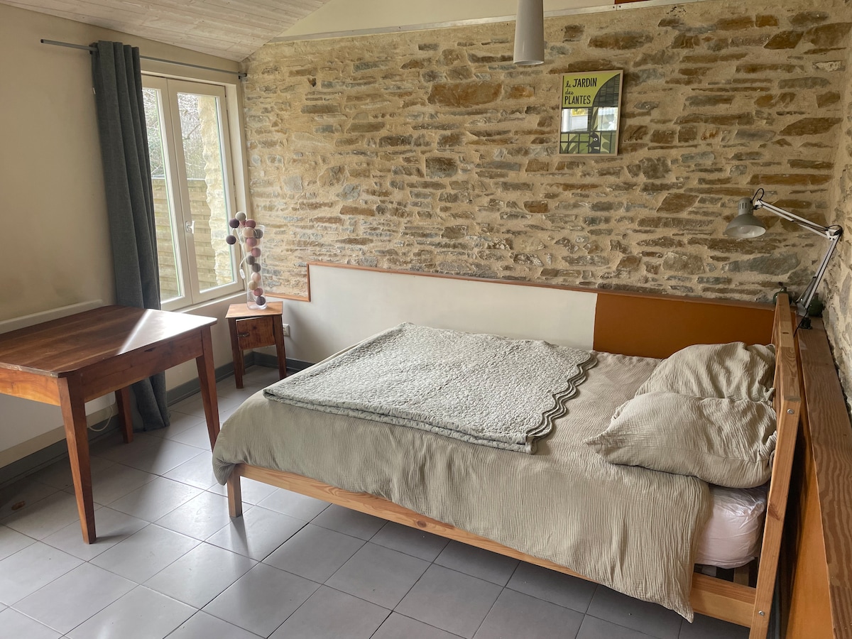 Mime-se com uma pausa atemporal em Gîte Onirique: uma casa do século XVIII cheia de charme, com paredes de pedra e lareira. A 15 minutos de Nantes, tranquilo, com jardim a poucos passos de distância, cozinha equipada e check-in autónomo. Perfeito para um casal que procura desligar-se, natureza e um lugar atípico com a possibilidade de uma cama de criança (cama queen + poltrona conversível) Um sofá-cama de 140×190 completa o espaço Capacidade máxima de 4 Ambiente suave e acolhedor.