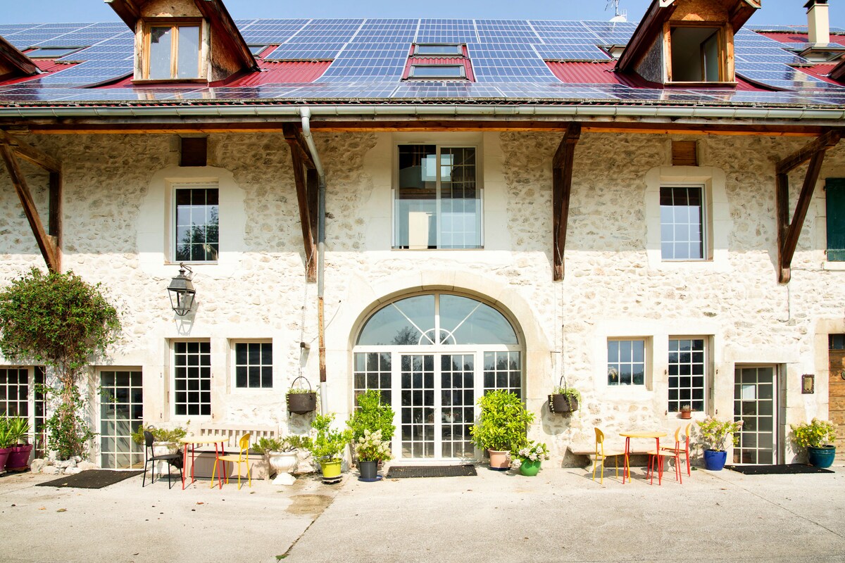 A place of calm and beauty close to Geneva: comfortable, quiet , renovated with love 1BR studio apartment (32 m2), part of our lovely home with independent entrance, own kitchen, bathroom w/ shower, big garden, high-speed WiFi, TV, bikes, next to town, countryside, hillside forests. On a quiet road with no through traffic. Geneva-airport/Nyon 15 min by car. Public transport access ca20 min walk or by bike. Ideal for recreation & business. Good value in an expensive region.