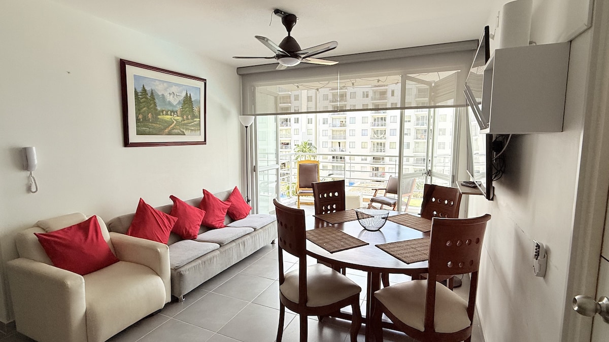 Moderno apartamento vacacional de lujo completamente amoblado con 3 habitaciones cada una con aire acondicionado y ventilador, ubicado en un piso 11 con vista a las piscinas y zonas comunes para disfrutar en pareja o en familia. Habitación 1 cama doble con auxiliar TV 43 " Disney+ Netflix barra de sonido - habitaciones 2 y 3 con dos camas sencillas, 2 baños - Sala Comedor con balcón TV Disney+ Netflix barra de sonido - Wifi y parlante bluetooth. Cocina, lavadora y parqueadero propio cubierto.