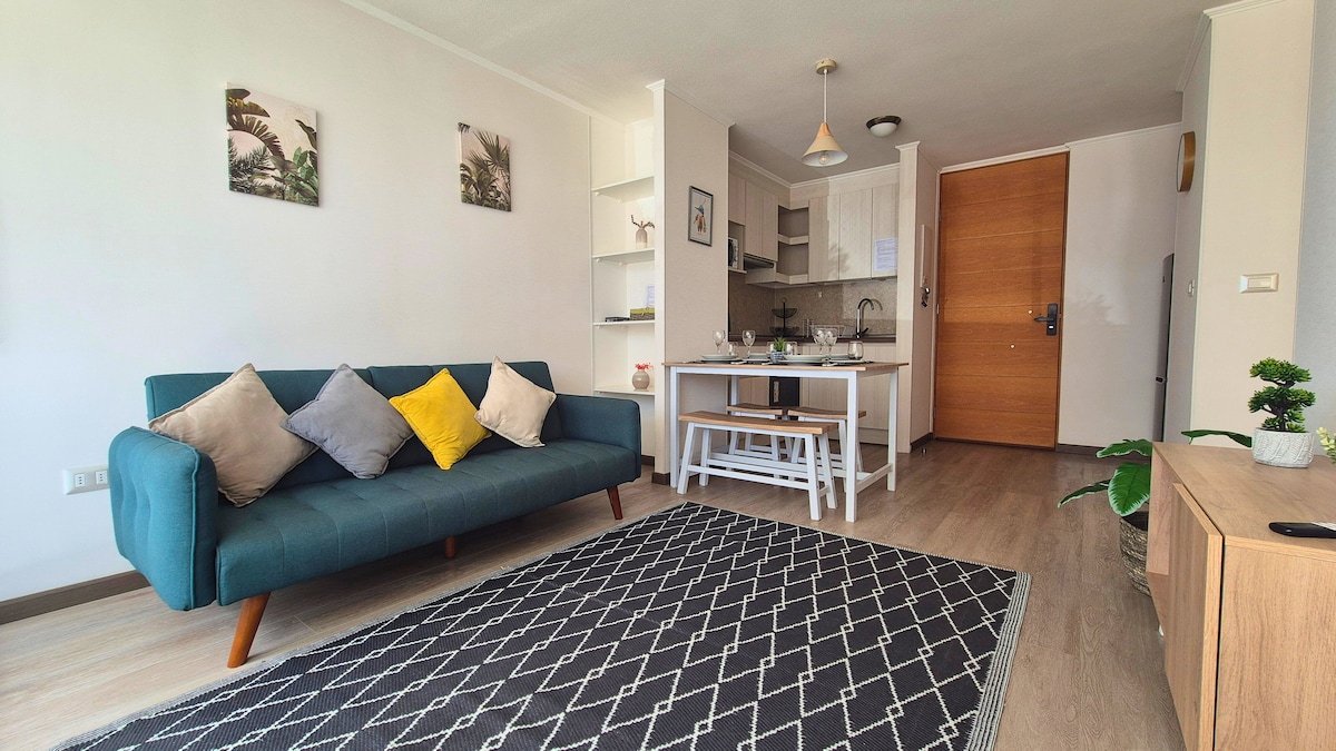 Relaxe neste belo apartamento totalmente equipado. * Wi-Fi rápido * Aquecimento * Secador de cabelo * Um ferro de engomar * Roupa de cama * Torradeira elétrica * Material de leitura * Jogos de tabuleiro * Calças de segurança em todo o espaço Desfrute de uma piscina ensolarada com áreas verdes, área de lazer, quinchos, quarto polivalente, estacionamento, acesso controlado 24 horas e acesso a pé às melhores praias da cidade.
