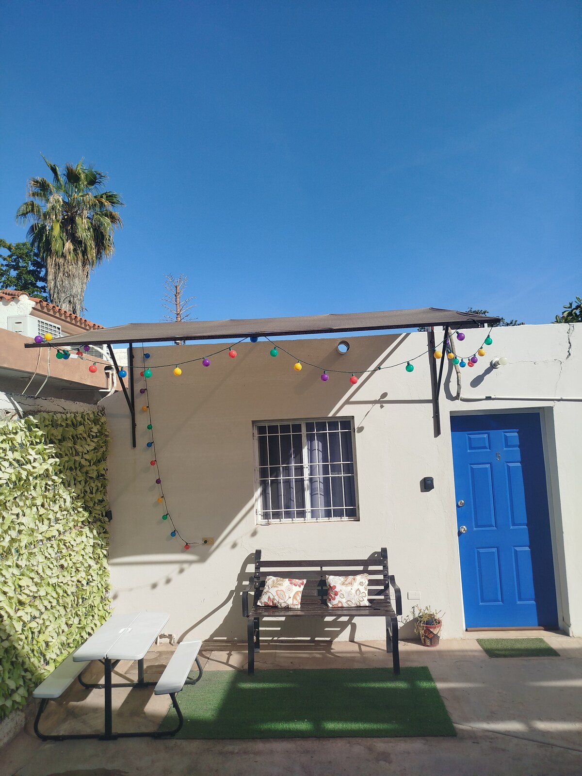 Uma casa elegante com sala de estar espaçosa, quarto principal queen size com casa de banho privativa, armário, TV e secretária. Um segundo quarto em espaço aberto com camas queen, armário, TV e secretária. Uma casa de banho completa adicional 2 para os visitantes, hall de entrada, cozinha equipada, com fogão a gás, Relaxe num jardim partilhado com uma churrasqueira pronta para um assado de carne assada sob as sobras de bambu espetacular numa mesa de jardim. Chega a pé um quarteirão até ao IMSS