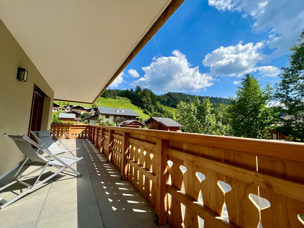 Classificação média de 5 em 5 estrelas, 30avaliaçõesMorzine T3 novo com vista para a montanha e acesso Multipass de verão