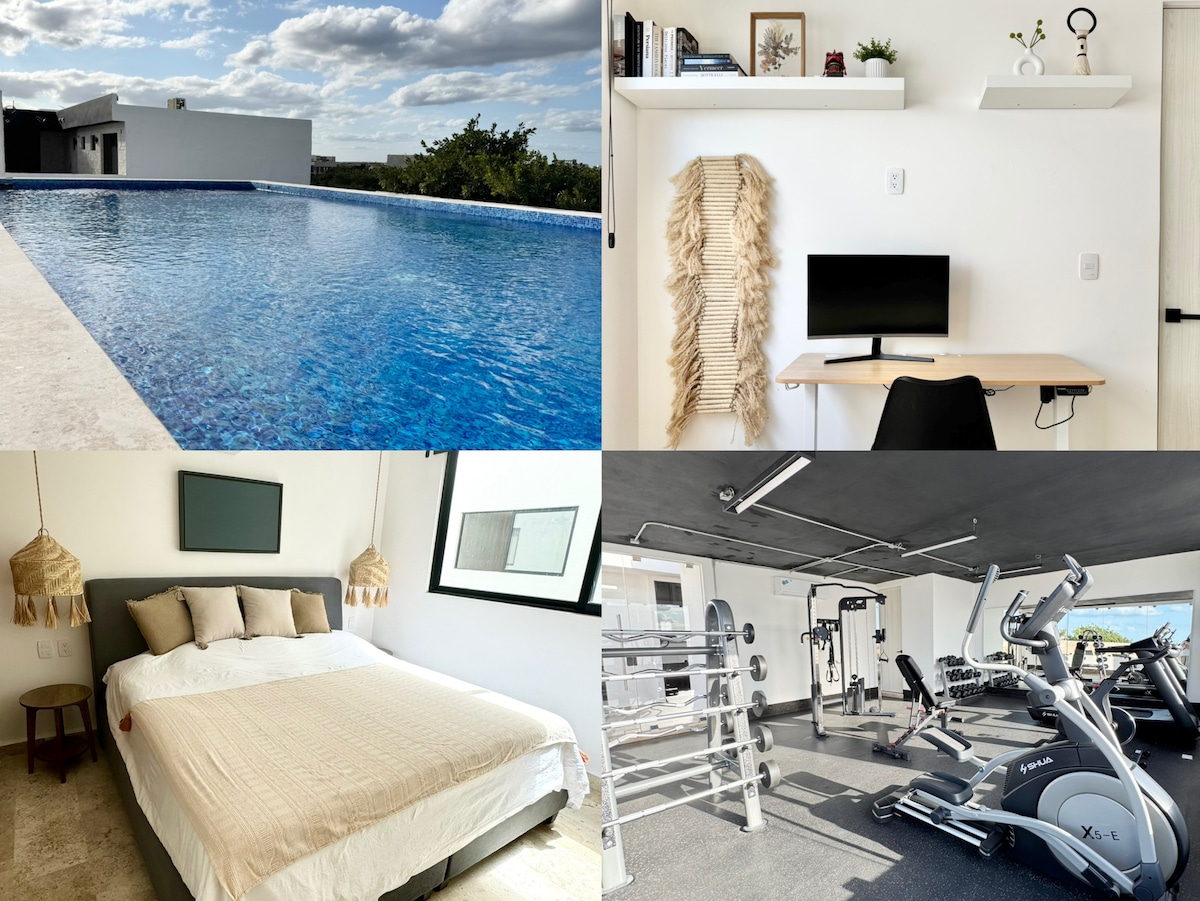 Apartamento de luxo em Aldea Zama. A 7 minutos de carro da praia, a 5 minutos de carro do Centro de Tulum, a uma curta distância a pé de restaurantes e lojas em Aldea Zama. Móveis locais e de alta qualidade criam um ambiente limpo e artístico. Piscina privada e estacionamento subterrâneo. Duas bicicletas gratuitas. O seu próprio teatro desce do teto com o clique de um botão. Cozinha totalmente equipada, TVs, Jogos. Nem vai precisar de sair.