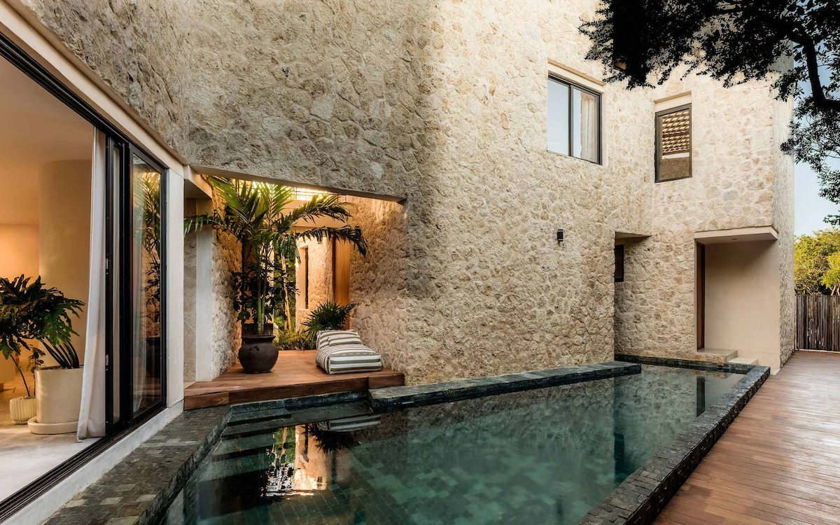 *Wabi-Sabi themed villa in the heart of the jungle* Casa Viva - Minutes drive to Tulum's beach and the best restaurants - Large relaxing pool - Gym inside the property with punching bag - Rooftop plunge pool for amazing sunsets - Zen room with art installations - One of the most exclusive areas in Tulum with only a few properties built - Office space for remote work One of the closest villas from Tulum’s top beach clubs and restaurants, yet perfectly private, it’s ideal for family's, couples
