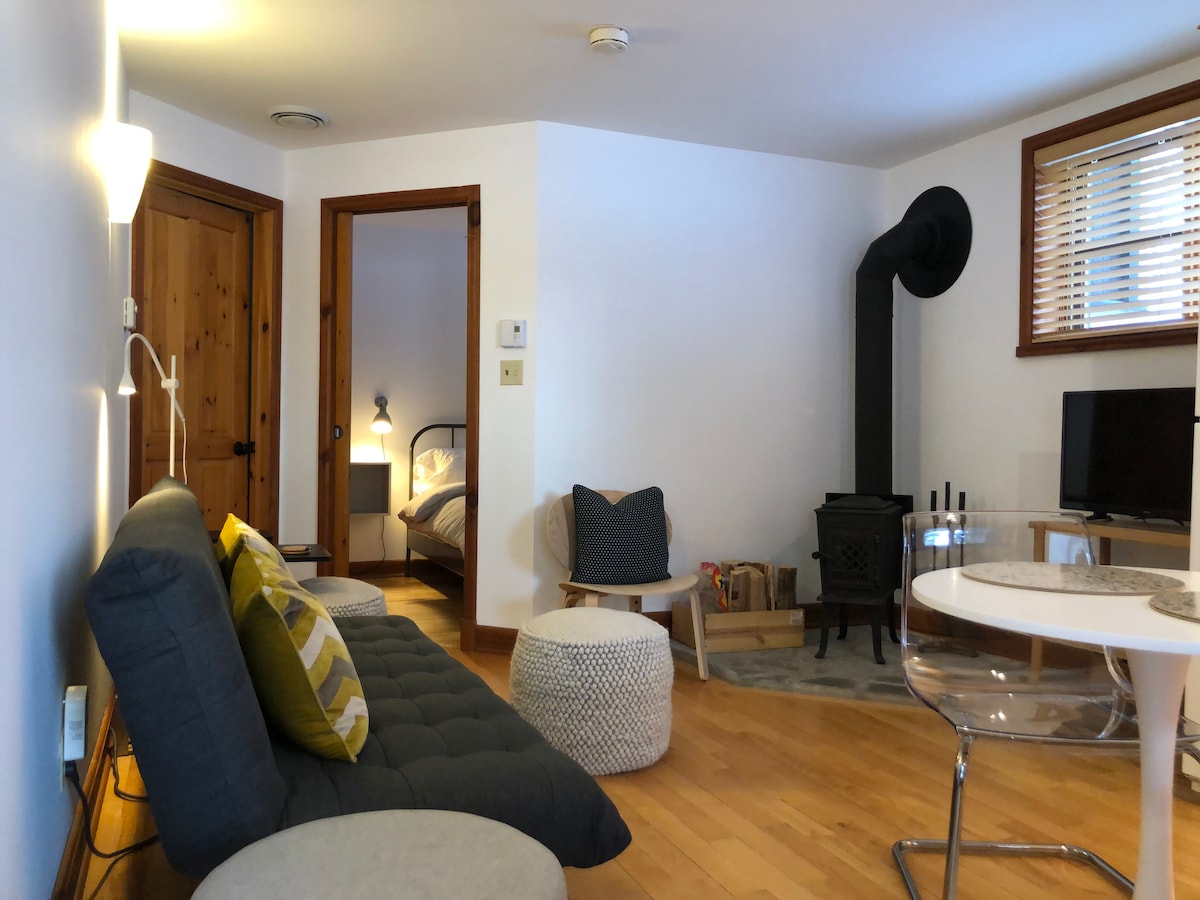 Our Nordic forest chalet is perfect for spending quality time as a couple (or with a kid), or for a work-retreat (with high-speed WiFi). The wooden interior is warm and cozy. The full-height windows offer stunning views over a forested valley. The open-concept kitchen and living room keep you in the conversation while cooking. If you prefer to cook outside, there is a fire pit with a grill and outdoor dining table. Only 70-min drive from Montreal. The lake is a 25-min walk if you park nearby.