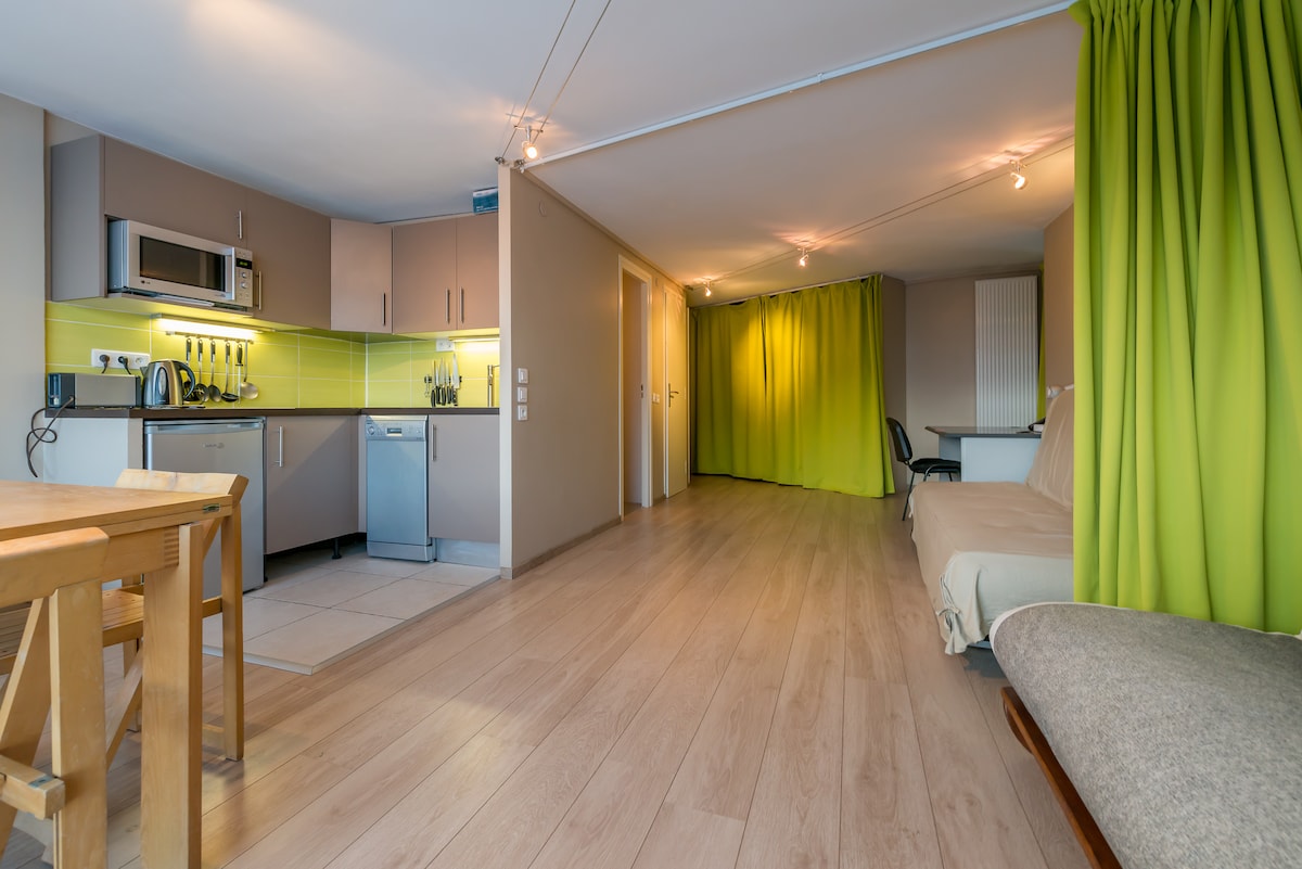 Estúdio cabine reformado de 17m2, ideal para 2 pessoas, mas pode acomodar 4 pessoas Tem 4 camas, um sofá-cama de casal na sala de estar e 2 camas dobráveis na entrada A 2 minutos a pé dos teleféricos (150 m) e perto de todas as lojas, uma parada de ônibus gratuito fica logo abaixo do prédio O apartamento dispõe de máquina de lavar louça, cafeteira, torradeira e chaleira, bem como de um armário de esqui Lençóis, toalhas e limpeza estão incluídos Wi-Fi gratuito