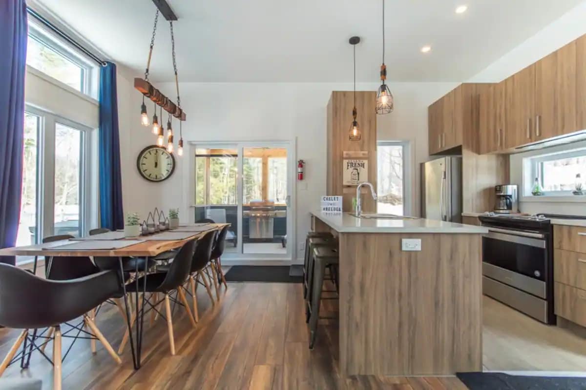 Our Nordic forest chalet is perfect for spending quality time as a couple (or with a kid), or for a work-retreat (with high-speed WiFi). The wooden interior is warm and cozy. The full-height windows offer stunning views over a forested valley. The open-concept kitchen and living room keep you in the conversation while cooking. If you prefer to cook outside, there is a fire pit with a grill and outdoor dining table. Only 70-min drive from Montreal. The lake is a 25-min walk if you park nearby.