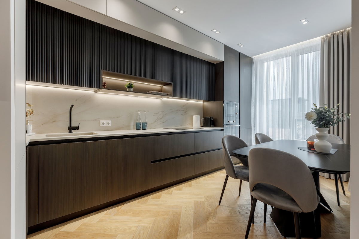 Apartamento novo, acolhedor e moderno com um teto de 3 metros de altura. Smart TV, NETFLIX, sistema de alto-falantes, terraço ao ar livre, sala de jantar com janelas panorâmicas. "Este apartamento foi projetado para você se sentir quase em casa... mas mais confortável" - Svetlana, anfitriã