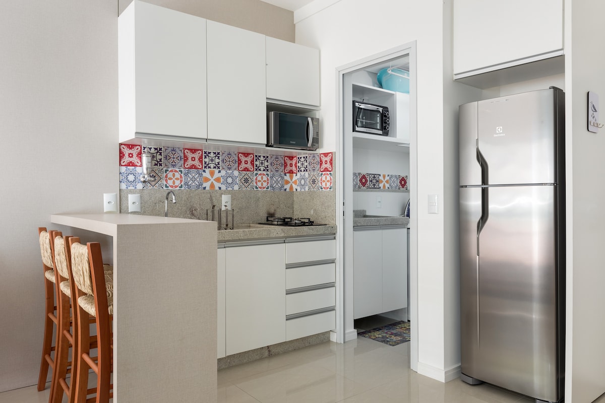 Estúdio com varanda e com linda vista para o mar. Perfeito para casais. Completo e aconchegante. Localizado a 5 min. caminhando até a Praia de Ponta das Canas conhecida por seu mar calmo, de temperatura amena e areia branca. Equipado com cama queen, Tv Smart, ar-condicionado, internet WiFi de alta velocidade, cozinha compacta e banheiro. Estacionamento de uso exclusivo para hóspedes no local. Próximo as principais praias do norte da Ilha (Praia Brava, Lagoinha, Canasvieiras, Jurerê...)