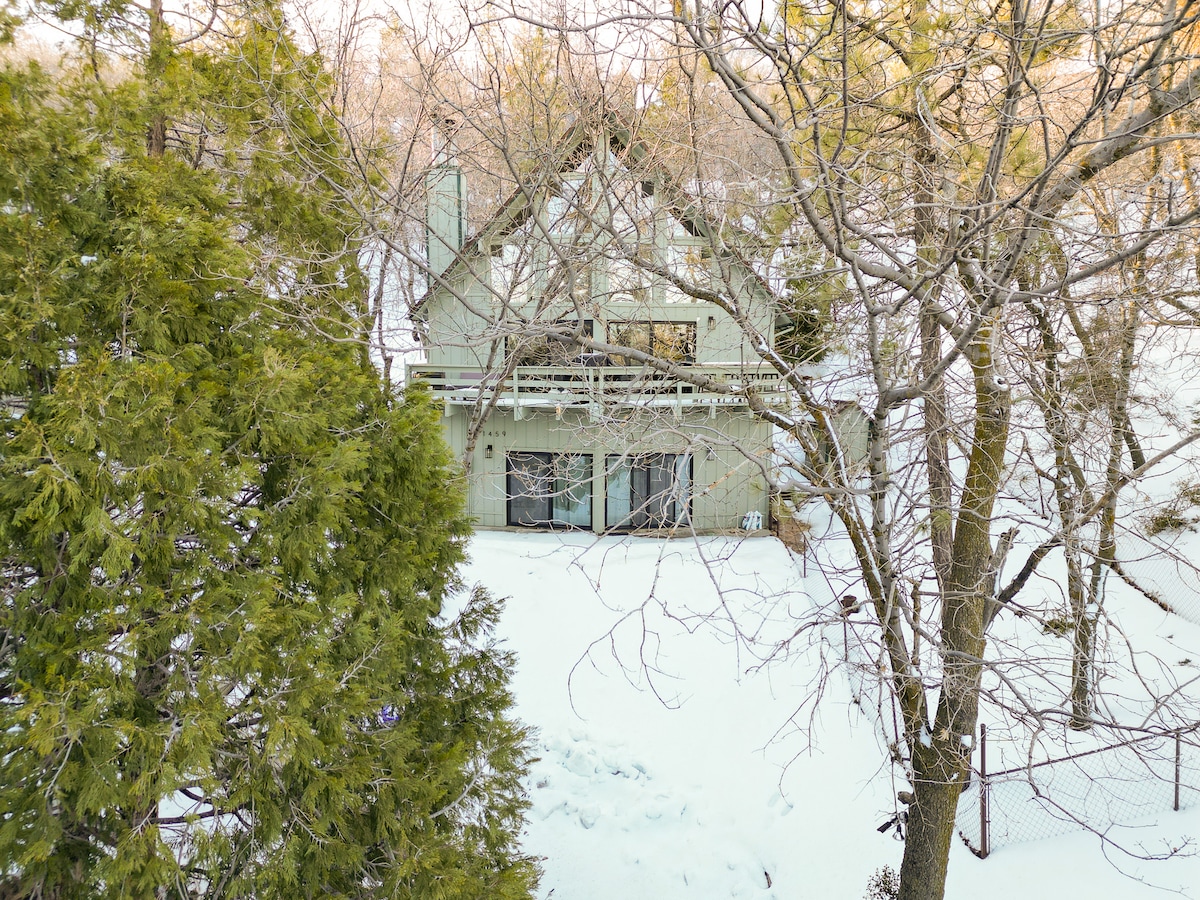 Casa MODERNIZADA com 4 camas e 4 quartos que tem vistas deslumbrantes do lago de todos os quartos! Nível principal que apresenta uma ampla sala de estar/jantar! A cozinha em aço inoxidável transita perfeitamente para a sala de jantar e o enorme deck panorâmico, churrasqueira e nova jacuzzi! Também localizado no nível principal está o Quarto Principal (King) - uma bela lareira a gás e madeira e banheiro completo! Este espaçoso chalé dispõe de banheiros para cada quarto. Novo no Airbnb, tem um registro PERFEITO de comentários dos hóspedes no "outro site de reservas".