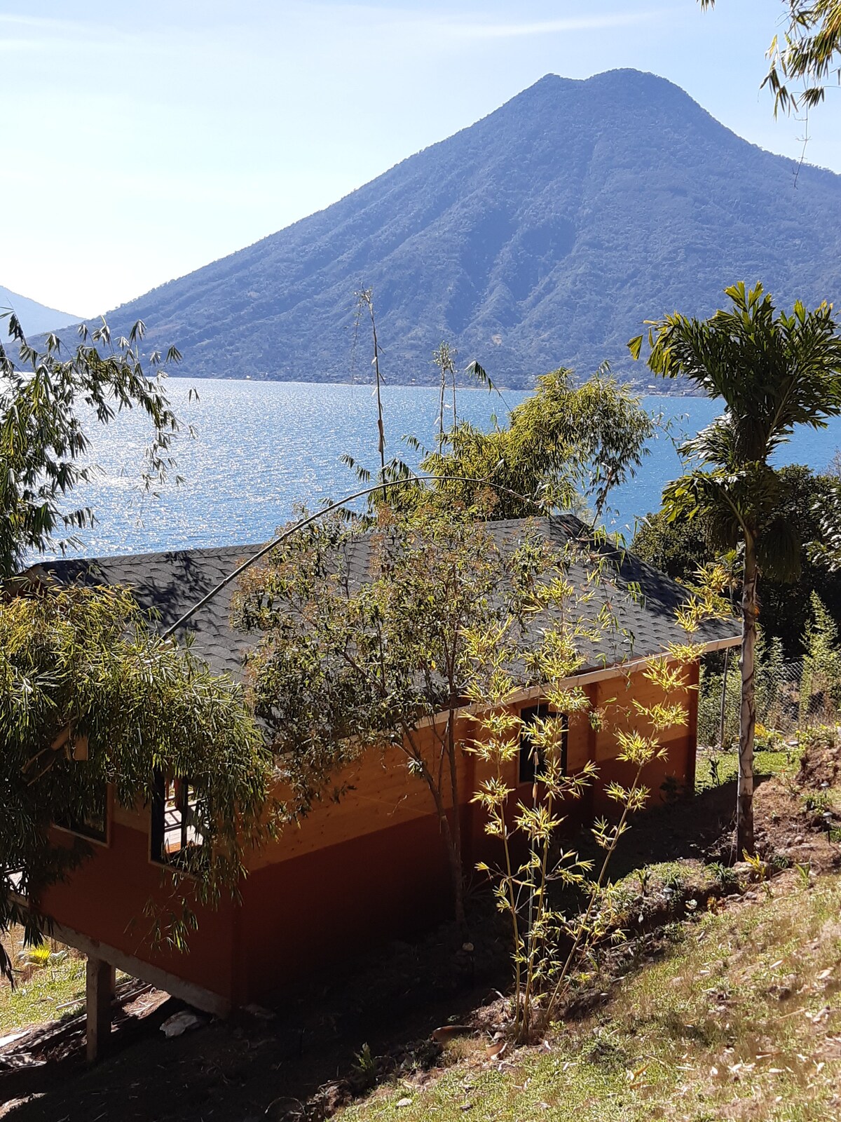DEVE CHEGAR DE BARCO NA SUA PRIMEIRA VISITA. Retiro ecológico isolado no Lago Atitlán para viajantes conscientes que procuram simplicidade, natureza e descanso profundo. Cabana aconchegante em frente ao lago com vista para o vulcão, nasceres do sol deslumbrantes e observação de estrelas incrível. Nade ou pratique paddleboard a partir do nosso cais privado. Possui uma sanita de compostagem, chuveiro solar (a água quente varia) e não tem eletricidade. Ideal para hóspedes que valorizam a paz, o bem-estar e a ligação com a natureza.