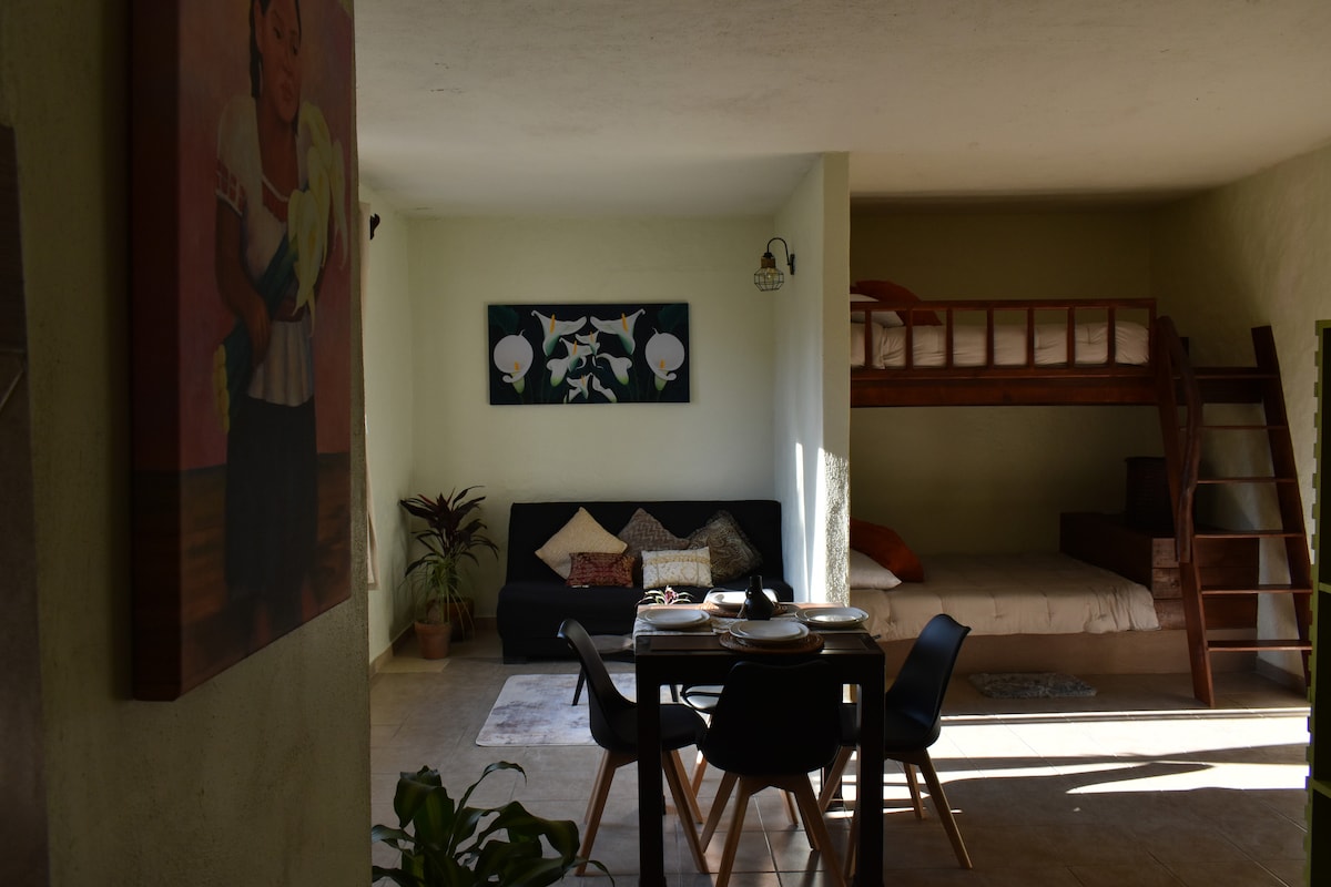 É um pequeno loft com uma varanda ideal para desfrutar como casal em todos os momentos do dia. Tem uma kitchenette, casa de banho privada, uma entrada separada, a 1 quarteirão e meio do Mercado de Artesanato, na mesma avenida principal em que encontrará restaurantes, lojas e caixas multibanco. Há ruído exterior porque está ao nível da rua, com boa localização a apenas 8 minutos a pé do quiosque central da aldeia e da estação rodoviária. Estacionamento gratuito a um quarteirão e meio.