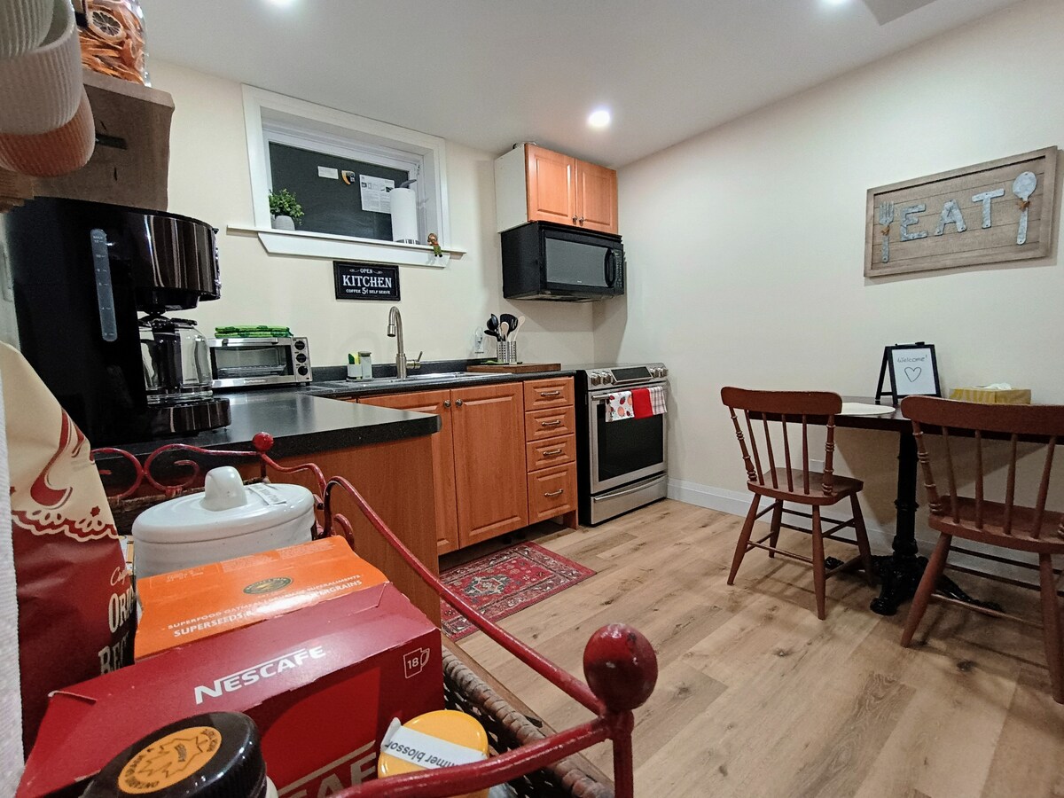 espaçoso apartamento de um quarto no porão, independente e com saída independente. (Entre pela entrada privativa nos confortos necessários para uma estadia ideal na margem do Grand River na histórica Fergus, Ontário. A uma curta caminhada do centro de Fergus e trilhas próximas. Uma viagem de cinco minutos o levará ao centro de Elora para explorar muitas lojas e restaurantes. Dentro de 5 a 10 minutos de carro, desfrute de mais beleza da área de conservação do desfiladeiro de Elora ou do lago Bellwood ou do Cox Cedar Cellars.