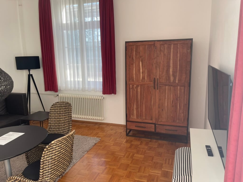 This charming apartment is located in a historic building in Konstanz and offers an ideal combination of a central location and comfortable living. It includes a cozy bedroom, a bright living room with a sofa bed, and a bathroom with a shower and WC. The kitchenette features a fridge, dishes, a kettle, and basic essentials. Rheinbad is a 10-minute walk away, and the city center is about 20 minutes on foot.