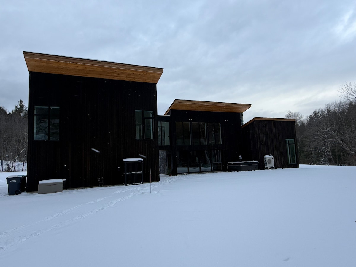 Our modern home is just 8 miles to Jay Peak. We have long range mountain views, you can check if the tram is running and enjoy exquisite sunsets all from the couch. The loft upstairs has an open floor plan with a comfortable living space, bathroom and platform bed, where you can view Jay Peak conditions. We now have Starlink high speed internet. There are 8 private acres half woods half open meadow feel free to walk around the property and enjoy the quiet sounds of nature.