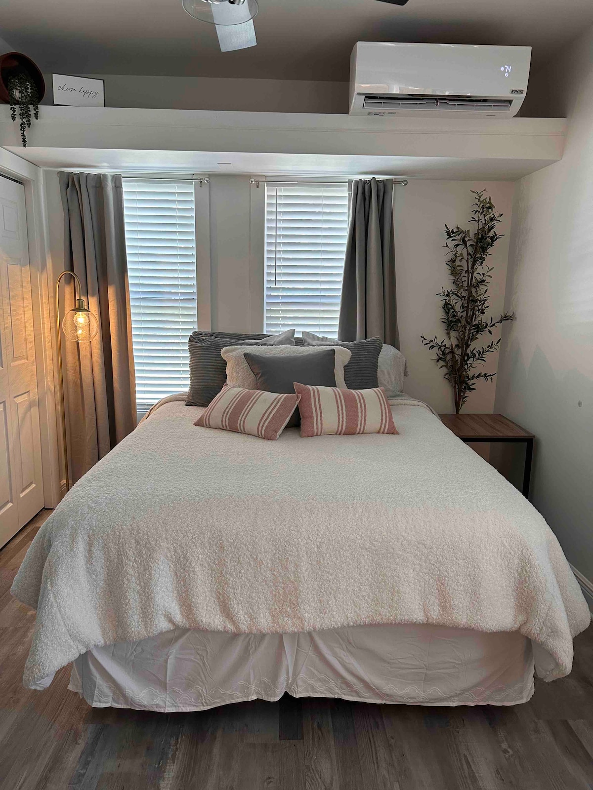 Você está alugando todo este apartamento de luxo king (3º andar sem elevador) no tranquilo bairro de arte do centro de Tallahassee. Estacione gratuitamente ou caminhe um pouco até o Capitólio, Centro Cívico, Faculdade de Direito da FSU, DOE, Gaines St, Parques, Cidade Universitária, estádio da FSU, Cascatas, jantar fino/casual/vida noturna. O mestre desfruta de um pôr do sol deslumbrante a partir deste complexo multiuso de arquitetura europeia. Cozinha totalmente equipada, Wi-Fi, Keurig, lavanderia, 2 TVs. Sofá secional acomoda 2 pessoas. Fins de semana de jogos exigem 2 noites no mínimo.