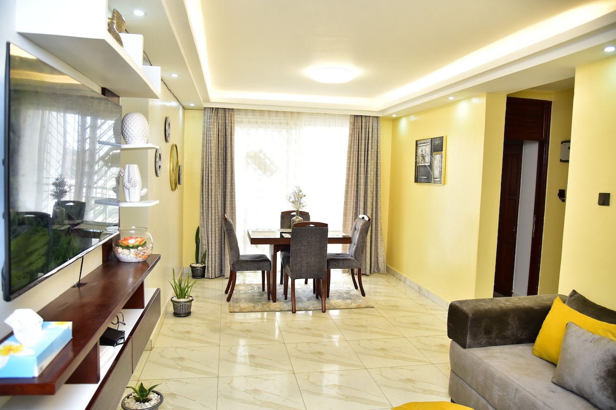 Este apartamento estético de um quarto está localizado em Naalya Estate, perto do Supermercado Quality. Fica a poucos minutos de carro da conexão de desvio norte que leva você ao aeroporto via Express Highway e perto do Shopping Acacia, bons restaurantes e bares nas proximidades. Há também uma série de rotas alternativas para o centro da cidade. As comodidades são: - Todos os utensílios de cozinha, por exemplo. Panela elétrica de arroz, máquina de café, liquidificador - Wi-Fi de alta velocidade - Smart TV Samsung de 55 polegadas - Barra de som Samsung - Máquina de lavar roupas