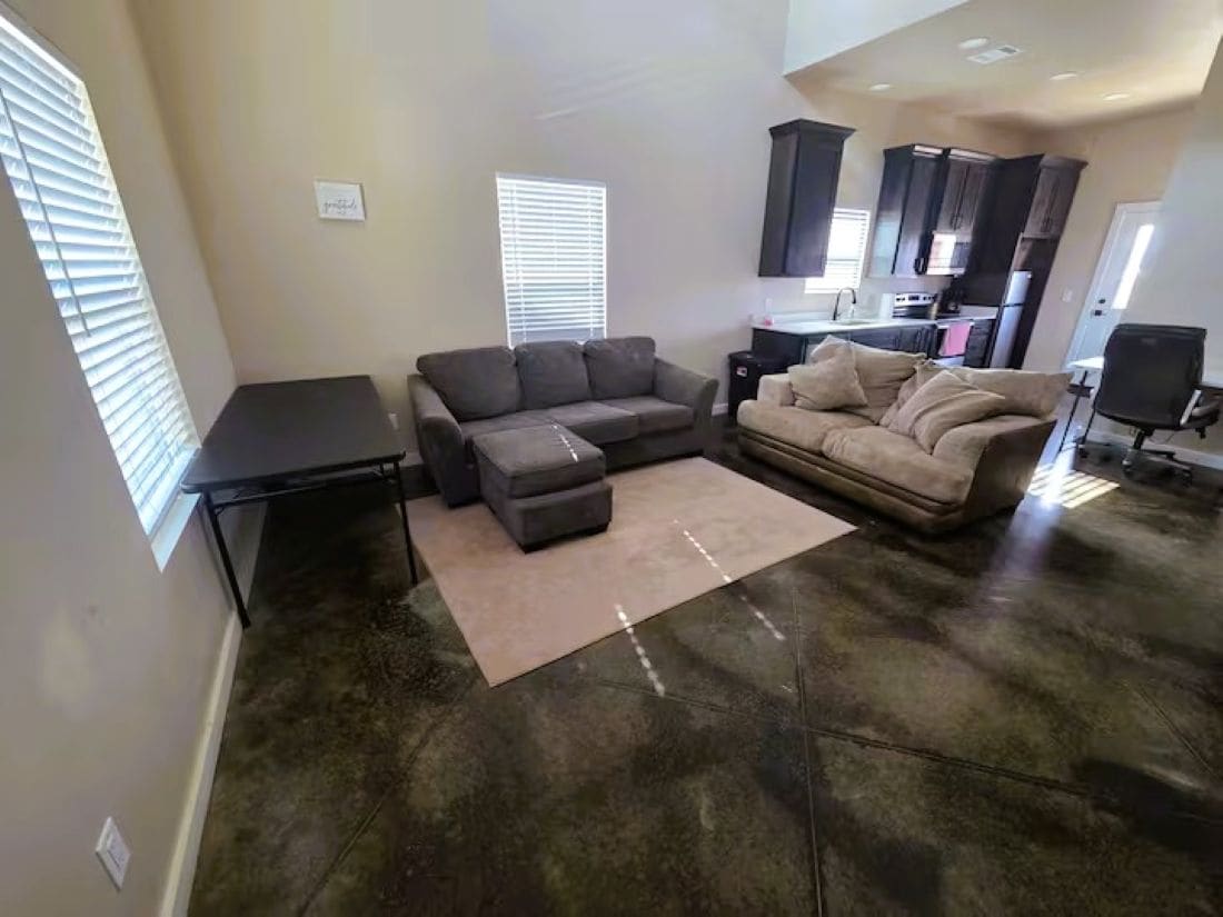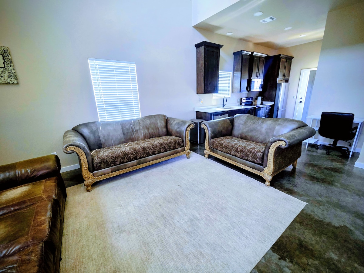 Bem-vindo à sua própria casa de hóspedes tipo estúdio privativo, com a sua própria vedação e porta para cães, para comodidade dos seus animais de estimação. Este estúdio de 56 m² combina o quarto, com uma cama de tamanho completo e uma secretária, a sala de estar e a kitchenette, todos em plano aberto, com a grande casa de banho e o closet, separados por portas. Também tem o seu próprio aquecimento central/ar condicionado para poder manter a temperatura ao seu gosto. Também terá acesso a um frigorífico de tamanho normal na garagem, a apenas 2 passos da sua porta, e a um lugar de estacionamento coberto.