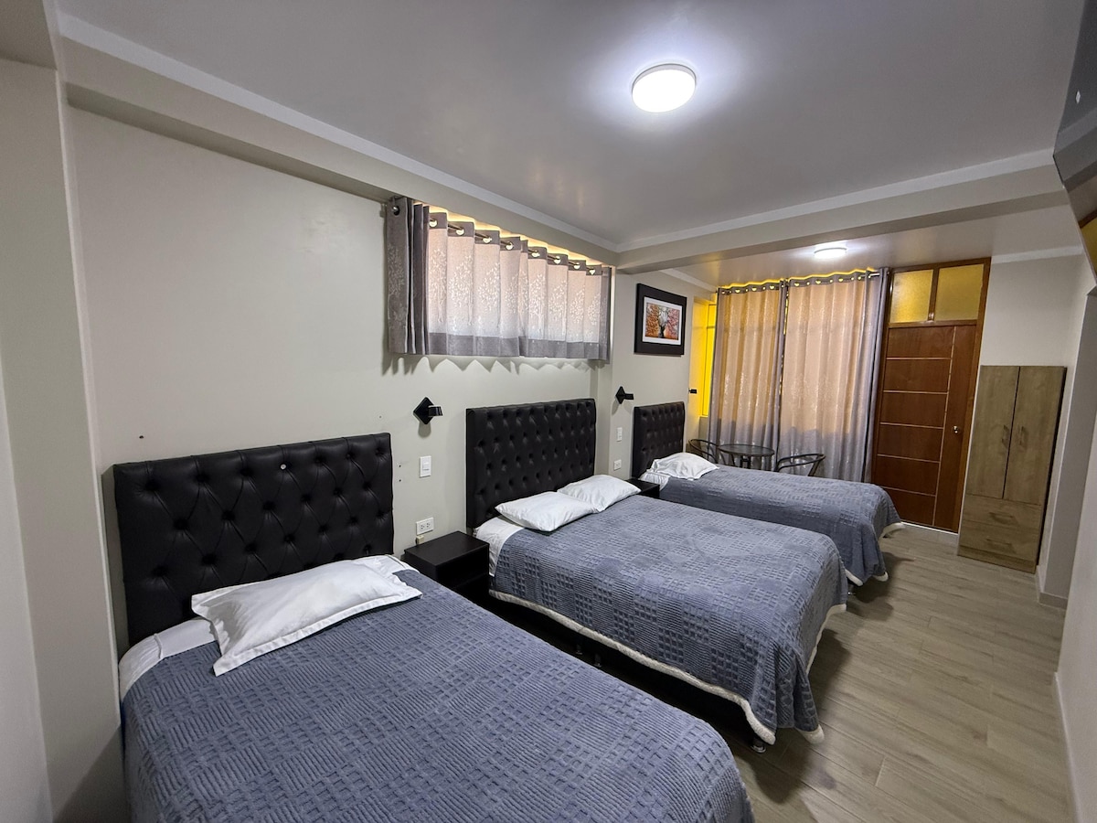 Moderno y tranquilo departamento ubicado en la Zona más Segura del centro de la ciudad de Juliaca, frente a Real Plaza,con todas las comodidades para hacer de su estadía una experiencia cómoda y cálida, en un departamento de 1 habitación con cama Queen y colchón ergonómico de espuma viscoelástica para un mejor descanso, también cuenta con un smart tv de 65" con internet de alta velocidad, 1 sala con vista para apreciar atardeceres, cocina equipada, baño y ducha con agua caliente las 24hrs.