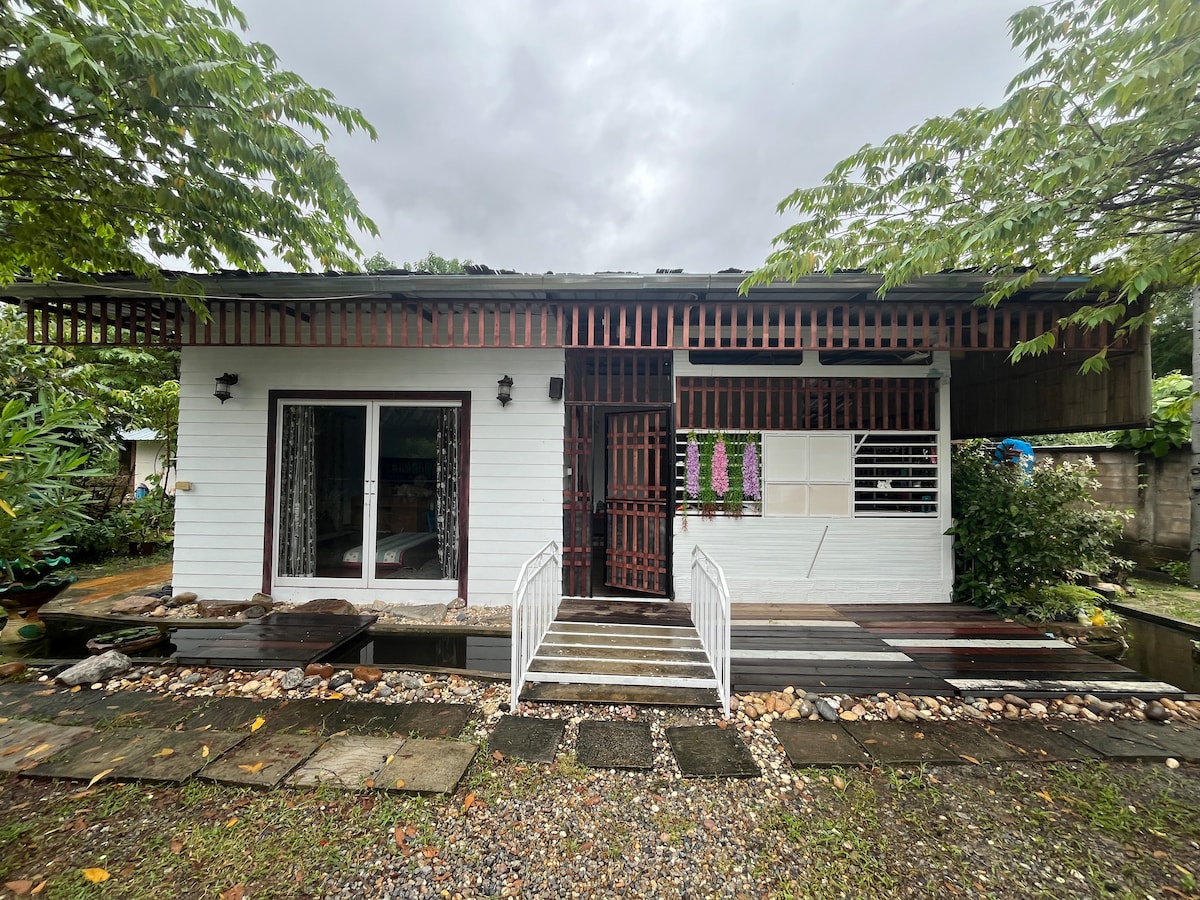 Temos uma casa de madeira em um jardim decorado em estilo Lanna. Localizada a cerca de 20 minutos de Chiang Mai. A casa tem 2 casas adjacentes. Existem 3 quartos e 3 banheiros. A casa tem uma cama king size. Cama tamanho Queen e duas camas de solteiro e cozinha. Wi-Fi gratuito. Divirta-se com suas férias e nossa casa.