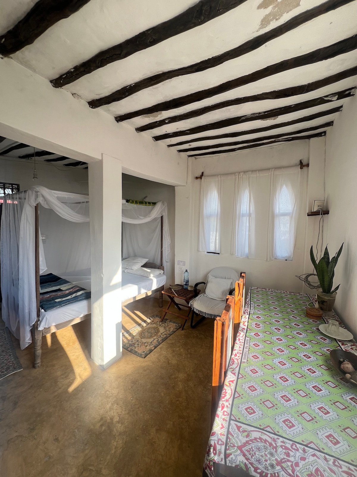 Uma joia cheia de luz. Apartamento de 2 andares e 3 quartos com uma linda varanda no terraço. Curta uma experiência relaxante e autêntica neste local bem-localizado. Cada quarto tem uma cama king size com banheiro privativo, ventiladores de teto e de chão. Cozinha totalmente equipada. A equipe está disponível para fazer compras, limpar e preparar refeições. Passeie pela aldeia e pela cidade de Lamu. A praia fica a 5 minutos a pé. Desfrute de excursões ao pôr do sol, pesca e mergulho com snorkel e incrível comida suaíli em maravilhosos cafés e restaurantes.