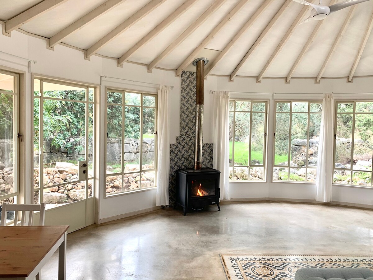 Uma cabana galileia situada na aldeia mágica de Klil; para casais ou viajantes individuais que desejam desacelerar, recarregar e abrir espaço para a beleza ♡ A cabana é íntima e acolhedora, cheia de luz natural e concebida com simplicidade silenciosa. Situado no coração da aldeia, tem vista para a sua paisagem única e está rodeado por um jardim selvagem e florido com uma piscina romântica no centro.