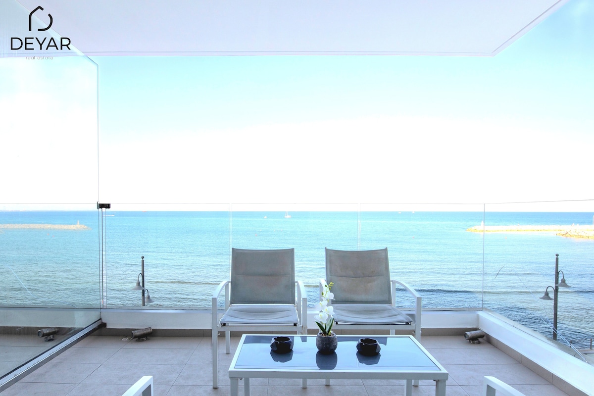 Seaview apartment, literally meters from the water. Prime location, no car required. Located at the heart of probably the most desirable tourist location in Larnaca. This seafront apartment offers unobstructed sea views, an amazing view of the Marina, only a few meters from the sea, you can relax at the sound of the waves and enjoy the view. Situated right next to the sea-side pedestrian walk which links the famous Finikoudes strip to Makenzy. Fully renovated, simply beautiful apartment.