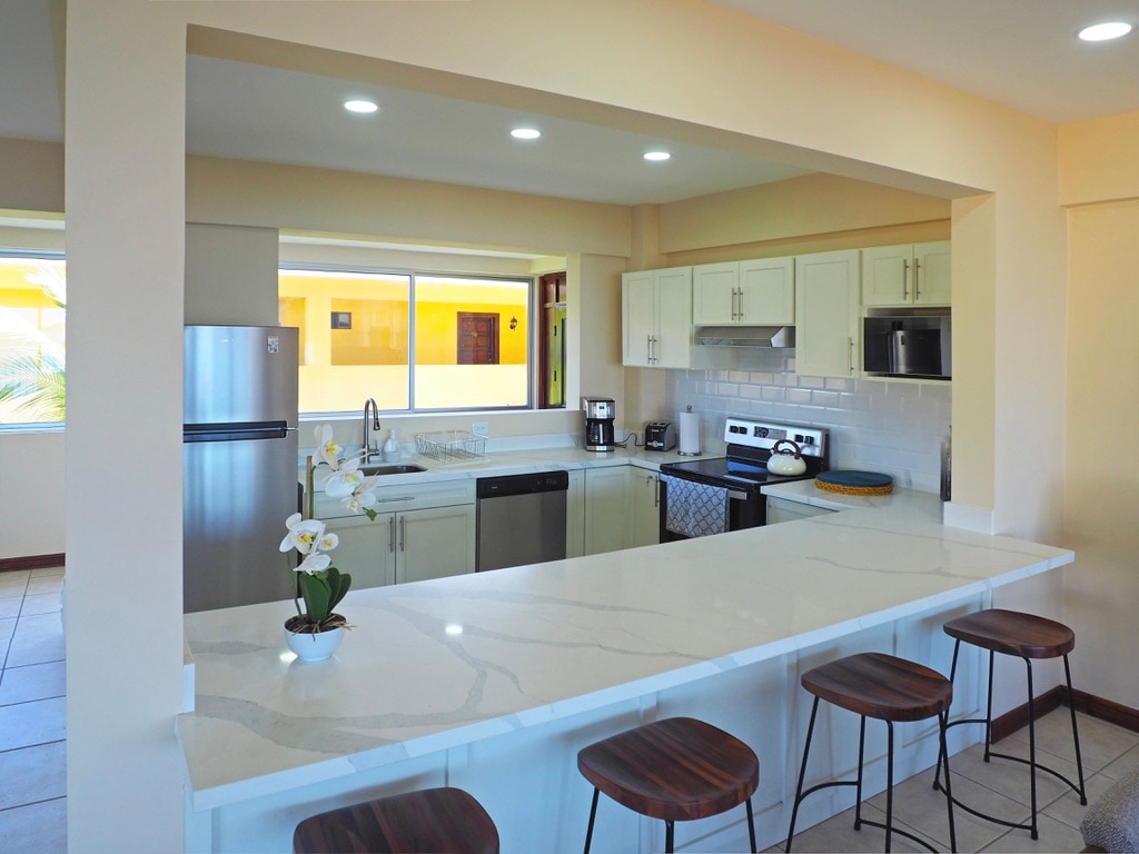 Desfrute de uma vida à beira-mar, vistas majestosas e pôr do sol a partir do seu próprio terraço privativo, pátio ou piscina! Este lindo condomínio de 1 quarto e 1 casa de banho tem uma cama king-size, casa de banho privativa e a cozinha tem uma grande ilha e está totalmente equipada com todos os utensílios de cozinha necessários para desfrutar de refeições em casa. Terá uma espaçosa área de estar e um terraço coberto para desfrutar das fabulosas vistas para o mar das Ilhas Catalina, da Marina do Flamingo e da Baía de Potrero. A apenas uma hora do aeroporto da Libéria.