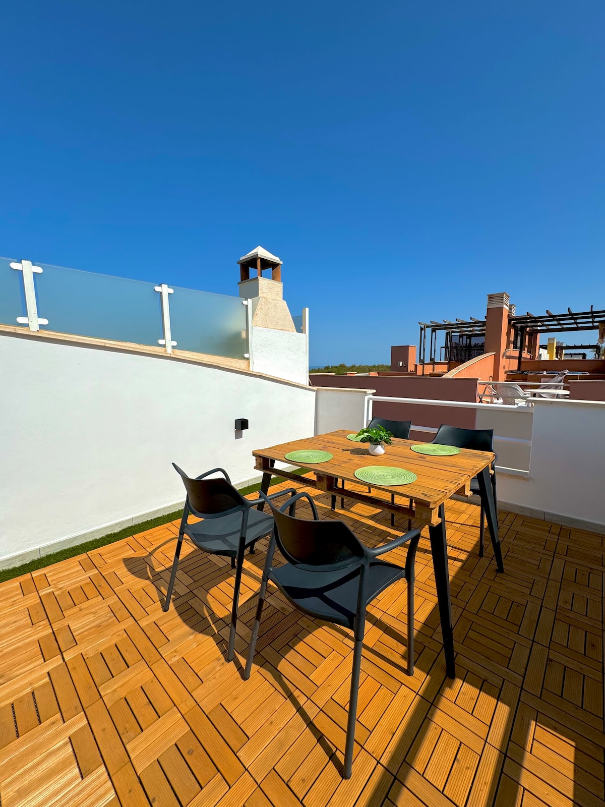 Desfrute das suas férias em Vera. Localizada em frente à praia, a apenas 300 metros do mar, a nossa penthouse duplex é perfeita para até 4 pessoas, pois tem um quarto grande com duas camas de 90 cm juntas e um sofá-cama de 150 cm. Mas, sem dúvida, o mais espetacular é o terraço de 35 m2, onde pode apanhar sol com vista para a piscina, comer ao ar livre, jantar sob as estrelas e relaxar no jacuzzi privado. E não se esqueça da piscina. Desfrute de dar um mergulho e brincar com os mais pequenos.