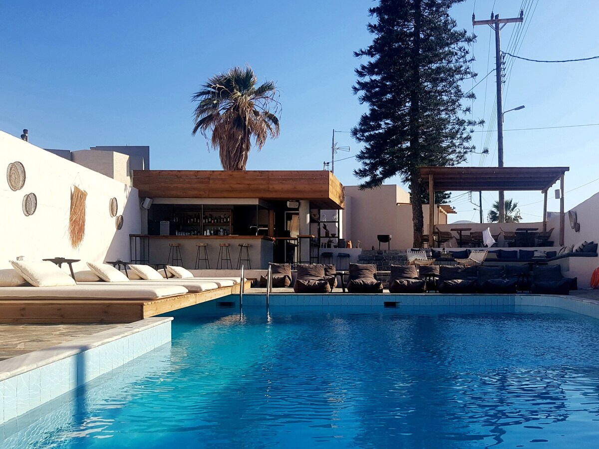 Fique no coração de Malia, na Bar Street! O nosso hotel boutique acaba de reabrir após uma renovação completa. Desfrute de um quarto elegante com casa de banho privativa, A/C e Wi-Fi. Relaxe à beira da piscina, jante no nosso restaurante no local e caminhe até todos os bares e vida noturna. Perfeito para casais ou amigos que procuram conforto, localização e diversão!