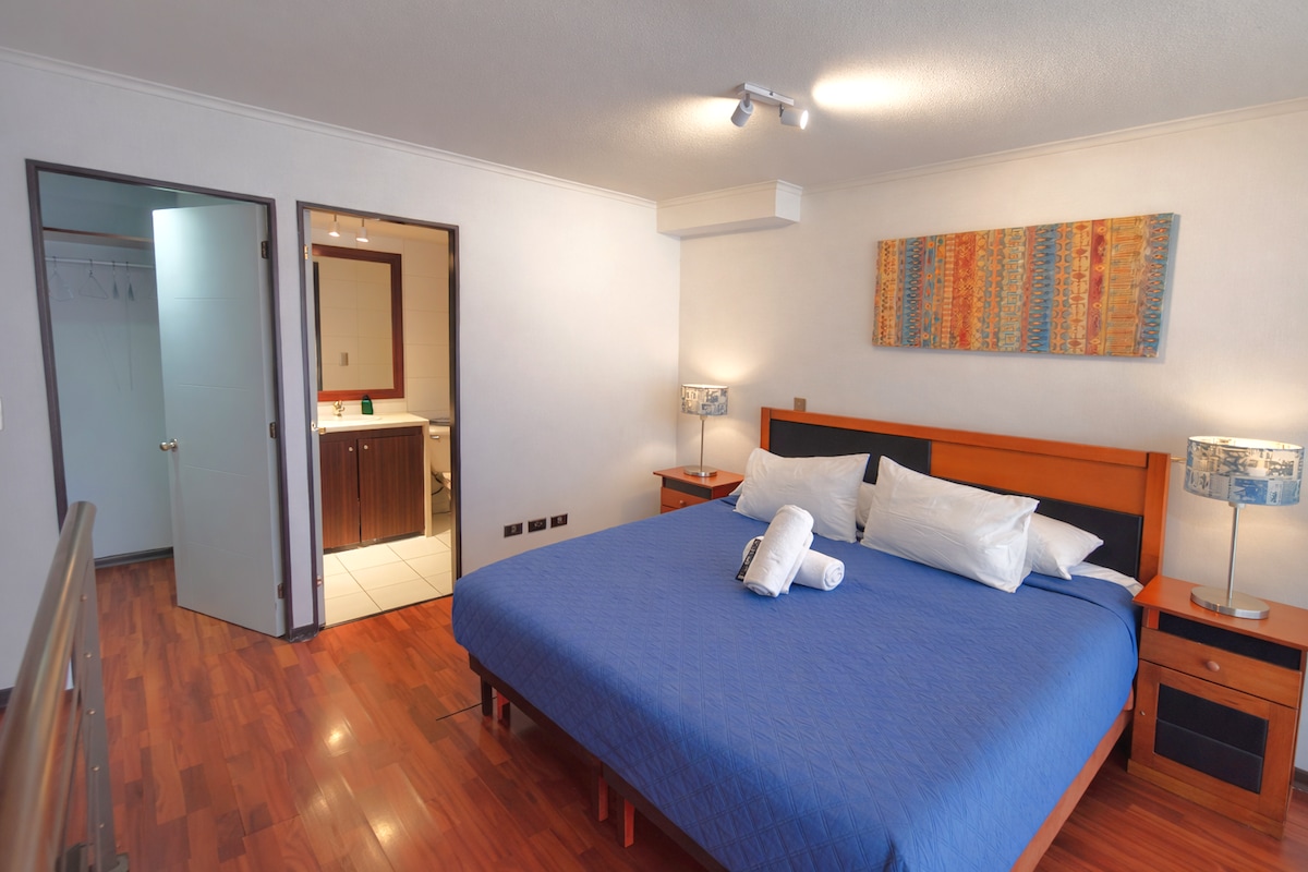 Localizado no Bairro Lastarria (Centro), a poucos passos de restaurantes, museus, boutiques. Metrô a 50 metros do Metrô Estação Universidad Católica. •Unidade de ar-condicionado frio/quente 12.000 BTU. • Fechadura eletrônica para check-in automático •Cozinha totalmente equipada: fogão, forno, geladeira, forno micro-ondas, cafeteira, torradeira, talheres, panelas, etc. • Máquina de lavar/secar roupa • Lençóis brancos 300 fios (cama queen size) • 2 TVs de 43 polegadas com Netflix • Internet/Wi-Fi 400 Mbps •Ferro de passar • Extintor de incêndio - Detector de fumaça - Detector de CO