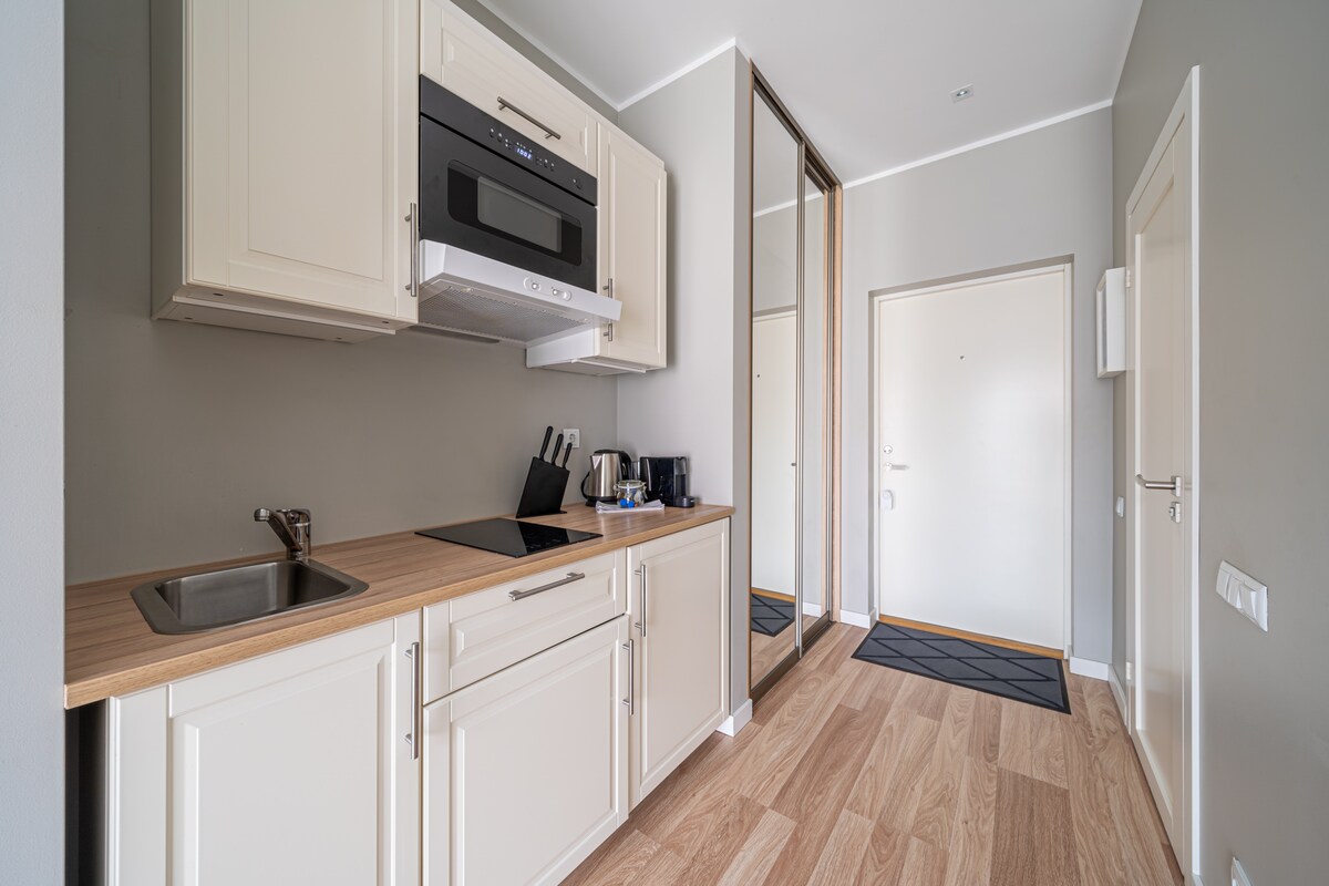 Novo! Estúdio acolhedor - a uma curta distância a pé de tudo o que pode precisar. Cama King Size (200x200) com colchão de alta qualidade. Também - uma única cadeira de sofá, para o terceiro hóspede. O apartamento está localizado num edifício renovado numa das principais ruas de Riga. Novos móveis e eletrodomésticos. Interior moderno. A 5 minutos da Cidade Velha, estação central. A Ópera Nacional, teatros, museus, galerias de exposições e salas de concertos ficam a uma curta distância a pé.