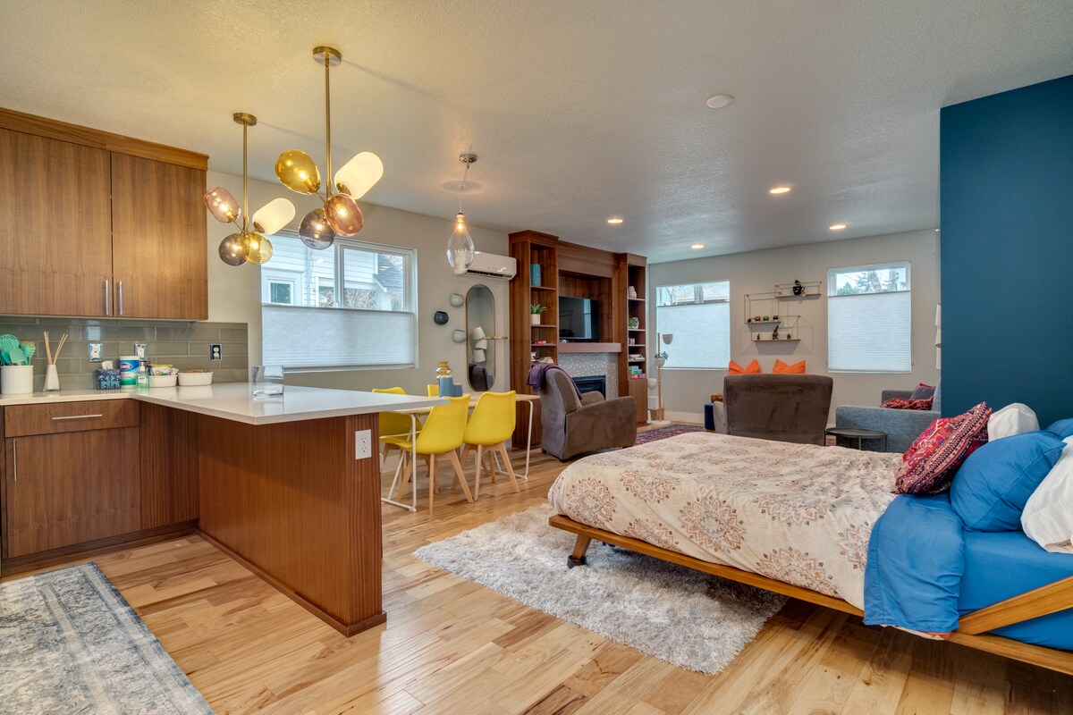 Apartamento moderno, luminoso e aberto no primeiro andar (sem escadas, 800 pés quadrados) com cozinha de chef e mesa de jantar, banheiro com banheira profunda, cama queen size de espuma de memória mais recente, área de estar com TV e lareira a gás. Muitas janelas, aquecimento e ar condicionado que você controla em um incrível bairro para caminhadas perto de várias dezenas de restaurantes e bares que se alinham quase 5 quarteirões na SE 28th ave, também chamado Restaurant Row + um alimento inteiro e um dos parques mais queridos da cidade.