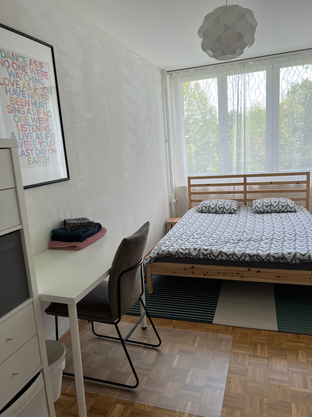 Our spacious and bright apartment features a bedroom, a living room with a sofa bed, a dining area, a bathroom and toilet, and a fully equipped kitchen. With abundant natural light, it creates a very pleasant ambiance. We can also provide all the necessary amenities for a child. The flat is situated next to the main train station and only a 10-minute walk away from the lake. You'll find a variety of supermarkets in the vicinity, as well as delightful bakeries and coffee shops.