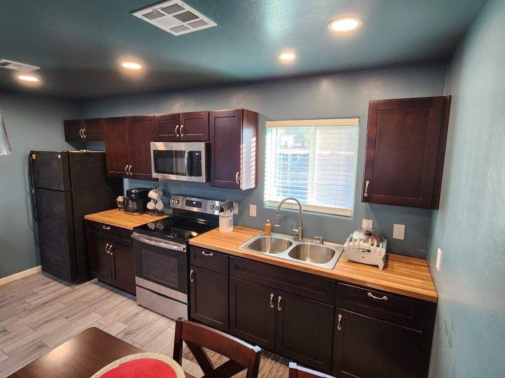 Recent Newly Constructed Private large 3 bedroom unit with modern kitchen which includes stainless steel refrigerator, stove, microwave, dishwasher, dining table for six, kitchen island that seats 4, large main bathroom with walk-in closet and large double sink. The 3 bedrooms have two queen size beds and two twin beds. There's a 75' Samsung TV in the Living Room and a 55" in the main bedroom. Also has a new large washer and dryer. Garage may be shared with the attached Separate 1 Br unit.