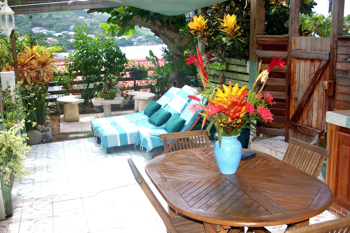 Charmoso apartamento moderno e independente com ar condicionado (322 pés quadrados), moradia do proprietário no rés-do-chão, terraço de madeira à beira-mar (160 pés quadrados). Este lugar único oferece uma vista soberba sobre o ancoradouro de Grande Anse d'Arlet e um acesso direto e gratuito à nossa doca privada e ao mar. A 3 minutos a pé da praia tranquila da Grande Anse ao longo da nossa pista privada.