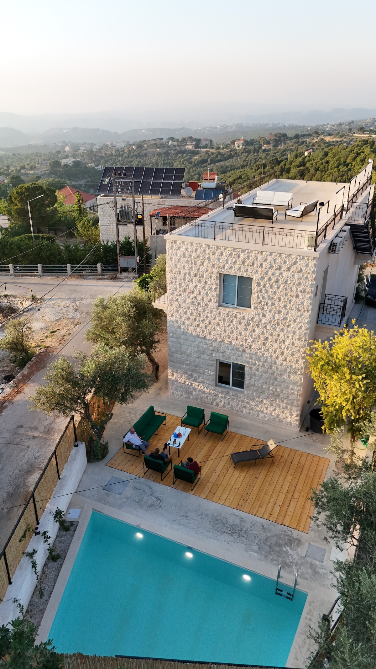 Esta moradia única está equipada com vistas excecionais limpas de energia solar 24/7 e pores do sol. Lareira interior, lareira exterior e jardins tranquilos para aproveitar a sua estadia. Uma bicicleta, uma mesa de pingue-pongue e uma piscina estão à sua disposição. ☺ É também uma área muito agradável para caminhadas com um campo de basquetebol e futebol nos degraus da casa! Este é um espaço novo e muito moderno, totalmente equipado com torradeira de máquina de lavar louça e robô de cozinha. Também estaria a 15 minutos das esplêndidas adegas de ksara.