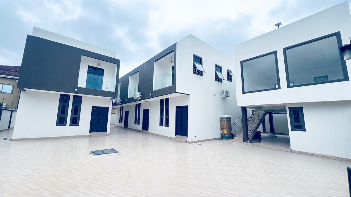 Experimente o conforto e o luxo neste novo apartamento fechado, adequado para famílias, em Spintex, Acra. Com um gerador de reserva, Wi-Fi, estacionamento gratuito, cerca de segurança e CCTV 24/7, é perfeito para viajantes exigentes. O apartamento fica numa zona residencial, a apenas uma curta distância de carro de: Mercearias + mercado Um ginásio Restaurantes (People Social Eatery, Dragon Room) Centro Comercial Orca, Centro Comercial Palace Hospital LEKMA (10 min) Aeroporto (15 min) Praia de Labadi (15 min) Legon Oriental (10 min) HoneySuckle Lounge Spintex (8 min)