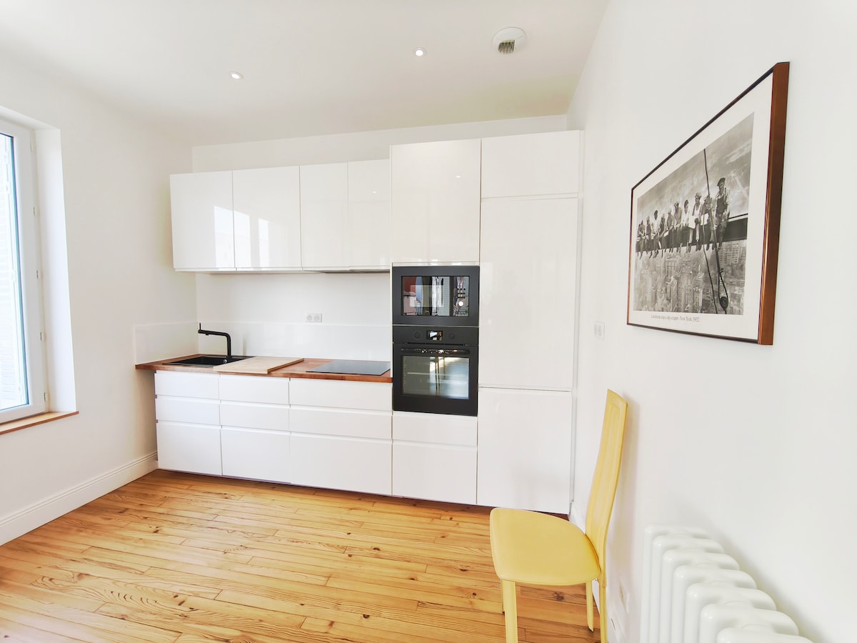 ⭐ Apartamento novo, elegante e luminoso, convenientemente localizado perto de comodidades. No 2º piso, dispõe de belos volumes e pode acomodar até 7 hóspedes: 3 quartos (1 cama de 160 cm, 2 camas de 140 cm + cama extra), 2 casas de banho, vestiários e cozinha de alta qualidade totalmente equipada (máquina de lavar e secar roupa). Sala de estar acolhedora com matraquilhos, varanda com vista desobstruída, parquet, tetos altos. 💻 Fibra de alta velocidade. Perfeita para famílias, amigos ou estadias de trabalho.