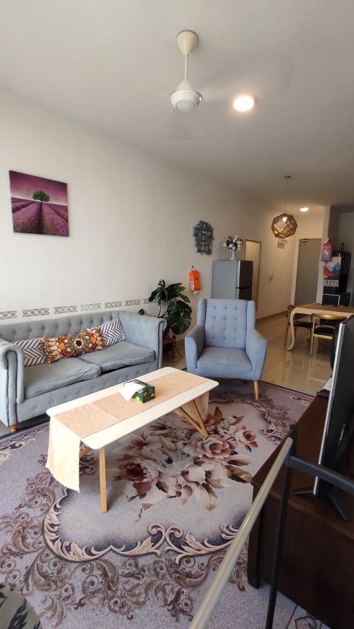 Homestay Landed ( 2-storey terraced house) 2.7km to Cinerea Hall - 3 air-conditioned bedrooms (1 king & 2 queen beds) - 2 Bathrooms + 1 Toilet - 1 kitchen (spacious) - 1 living room (spacious + air conditioning) -1 refrigerator unit - 55 inch TV (Youtube) - Wifi - iron - microvawe - Gas stove - Cuckoo - dishes + utensils for cooking -Washing Machine - gated house area - Car parking within the area house. -24 hours Guard lodge safety Give us 5 star review to redeem rm25 cashback