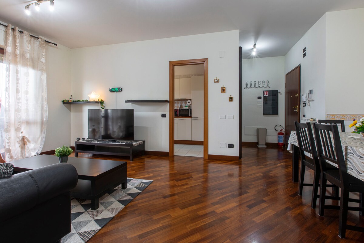 Apartamento acolhedor, confortável, espaçoso e luminoso, com um grande terraço. A 2 km da feira de Roma, adjacente ao centro comercial Leonardo Park e a 2 km do centro comercial Da Vinci. Estação de comboios a poucos minutos a pé na zona pedonal. Aeroporto Leonardo da Vinci a 7 km (1 paragem de comboio) e Feira de Roma a 2 km (1 paragem de comboio).