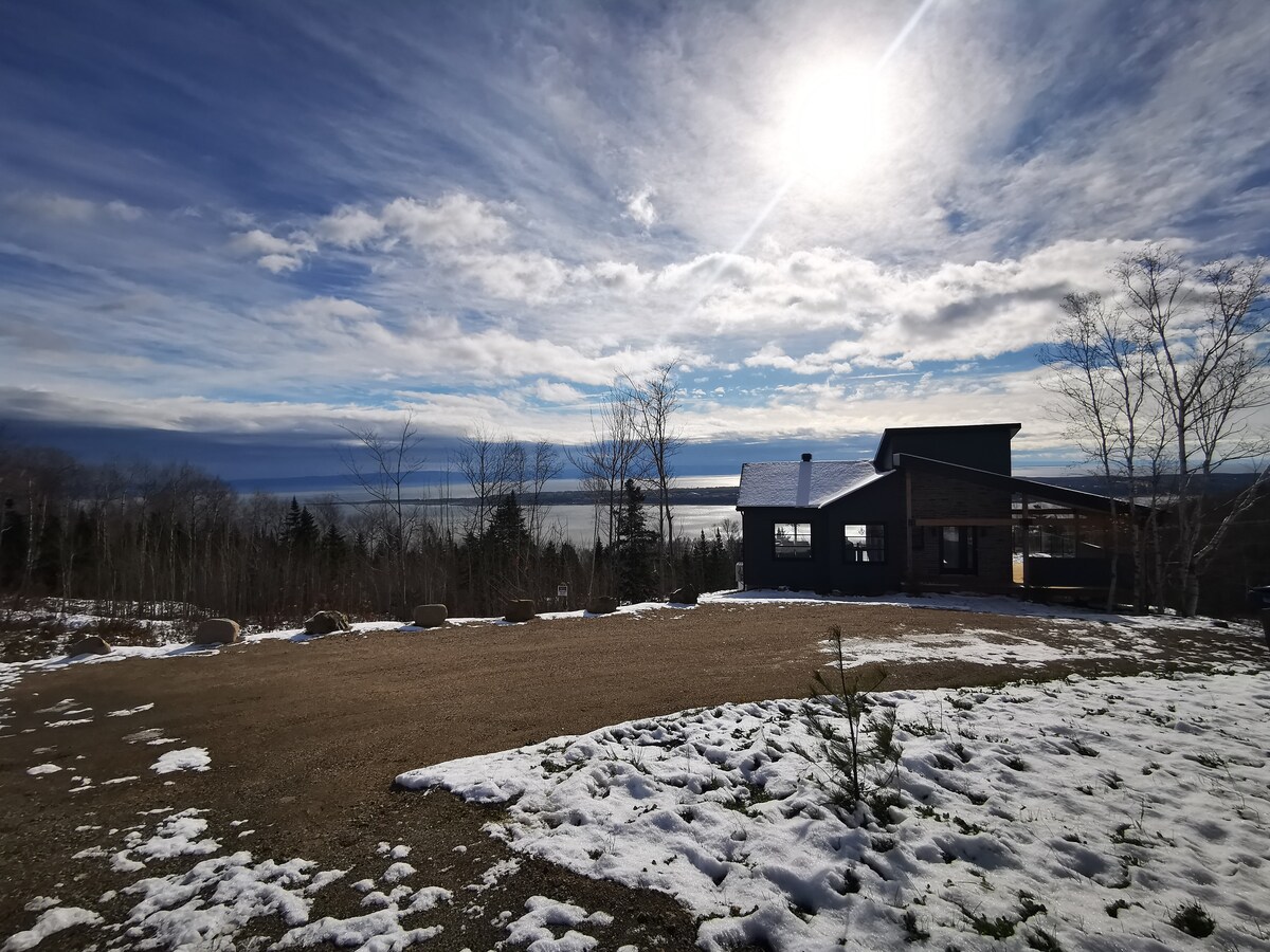 Pequeno chalé escandinavo para duas pessoas idealmente localizado para desfrutar das atrações de Charlevoix. Tem um circuito termas (banheira de hidromassagem, sauna, hammam) Muito intimista e no meio da floresta, a vista tem vista para o rio majestoso e as montanhas ao longe. Todo o equipamento moderno está lá e o conforto é absoluto, com ar condicionado e lareira ao ar livre. O design de conceito aberto foi projetado para uma experiência imersiva na natureza: grandes janelas, chuveiro panorâmico. Acesso através de uma estrada privativa a 500 m.