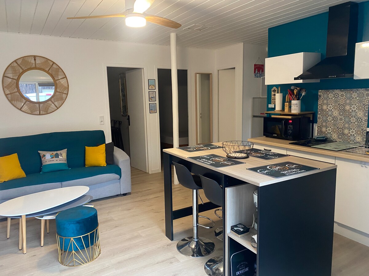Pequena casa de madeira com estrutura de madeira , acolhedor, tranquilo, entre o mar e a orla da floresta. Um grande terraço de madeira de 25 m² e um pequeno espaço ao ar livre permitem que você desfrute com tranquilidade das espreguiçadeiras e cadeiras disponíveis. A praia de Vergnes está localizada a 600 metros, o acesso é muito fácil a pé, a 7 km de distância encontra-se a vila de Talmont (acessível de bicicleta por uma ciclovia).