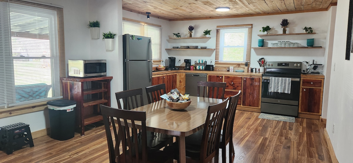Experimente as noites tranquilas do sul nas cadeiras de balanço da varanda da frente e desfrute do café da manhã em nossa cozinha totalmente abastecida, incluindo uma cafeteira compatível com Keurig ou carafe, panela de louça, liquidificador, torradeira e micro-ondas. Jantar em estilo rural com uma mesa que se expande para acomodar até 8 pessoas, ou jantar ao ar livre no deck do quintal. Ótimo para todas as idades: jogos de tabuleiro, brinquedos, livros, um quintal cercado, Disney+ e Amazon Prime Video. Há uma TV na sala de estar e no quarto King.