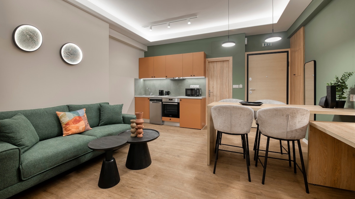 A Suíte Elegante é uma suíte recentemente renovada no coração de Pireu, situada no encantador bairro de Marina Zeas. A nossa suite elegante é perfeita para casais ou viajantes individuais que procuram uma estadia confortável e tranquila perto da praia. A Suite está equipada com mobiliário de alta qualidade e dispositivos elétricos e foi decorada com um ambiente acolhedor e convidativo. Terá uma ótima noite de sono na cama confortável e poderá começar o seu dia a preparar um pequeno-almoço encantador na nossa cozinha totalmente equipada!