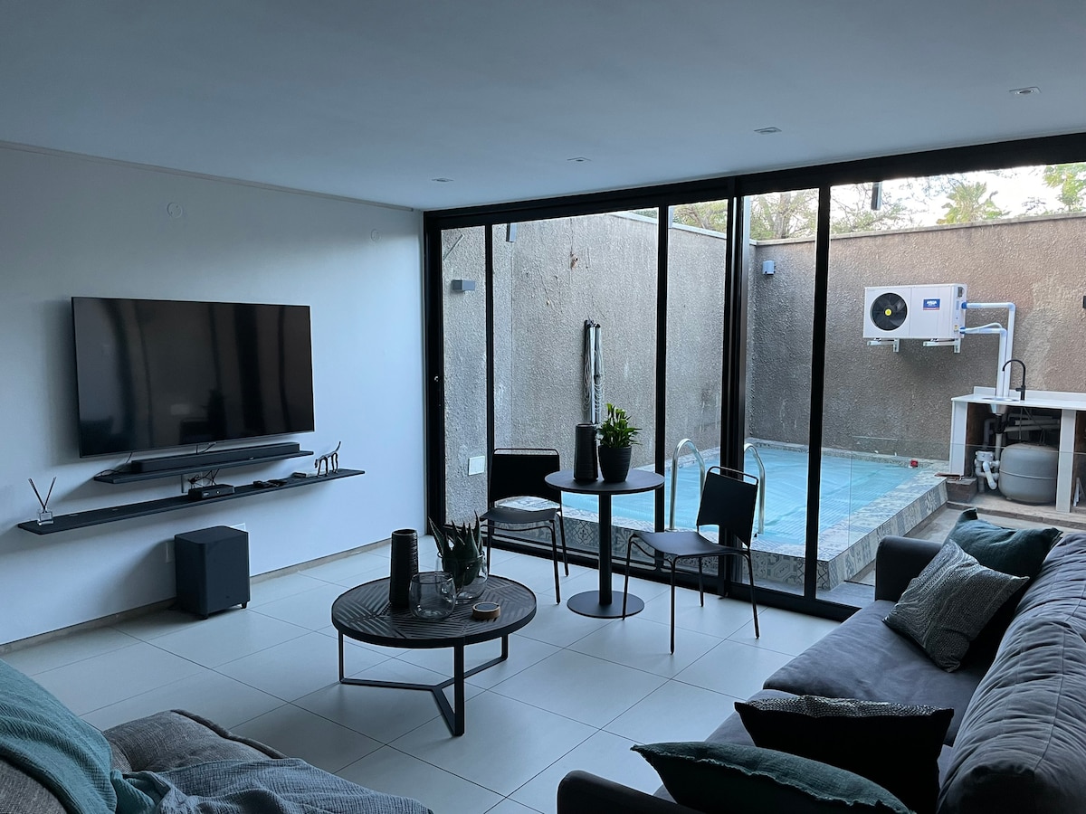 O Chalé é um espaço confortável industrial-moderno, que encontra o espaço casual do mato. Vigas de metal e paredes de tijolos expostos são suavizadas com estantes de livros do chão ao teto e telhado alto de palha. Design de plano aberto que leva a pátios, dá uma sensação de espaço e tranquilidade. Jardins internos e externos criam um ambiente exuberante. O chalé tem cozinha bem equipada, grande biblioteca, internet de fibra com forte cobertura Wi-Fi em todos os edifícios.