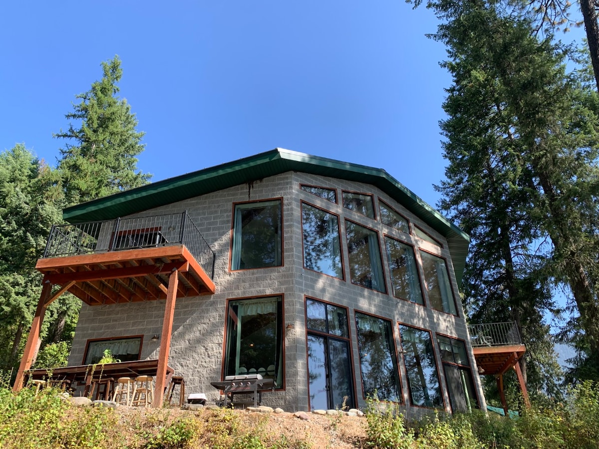 DESFRUTE DE UMA VISTA DESLUMBRANTE DO LAGO KOOCANUSA do topo da colina acima da Marina de Abayance Bay na nossa casa familiar recém-renovada. Escondida entre árvores num lote privado e espaçoso de 1/3 de acre. Relaxe junto à mesa de lareira no grande deck coberto. Acomoda 8 pessoas confortavelmente em 3 quartos, cada um com a sua própria casa de banho completa. Inclui uma garagem enorme para o seu barco, autocaravana ou trenós. A Marina fica a 2 minutos de carro e a 10 minutos a pé colina abaixo.