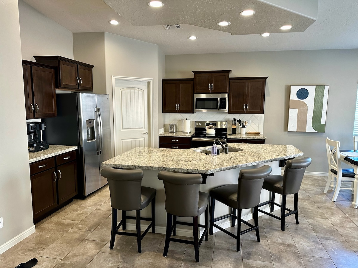 Desfrute desta "casa longe de casa" num bairro tranquilo e bonito. A casa tem uma cozinha totalmente equipada, 3 quartos - 2 quartos estão mobilados com uma cama queen size e a suíte principal tem uma cama king size, 2 casas de banho completas, 4 televisões inteligentes e máquina de lavar e secar roupa. O quintal tem uma grande banheira de hidromassagem e uma * piscina aquecida. Há muito espaço para relaxar, grelhar e assistir ao seu jogo de desporto favorito. *** há uma taxa adicional de 100 $ por dia para aquecer a piscina. Licença comercial #991430
