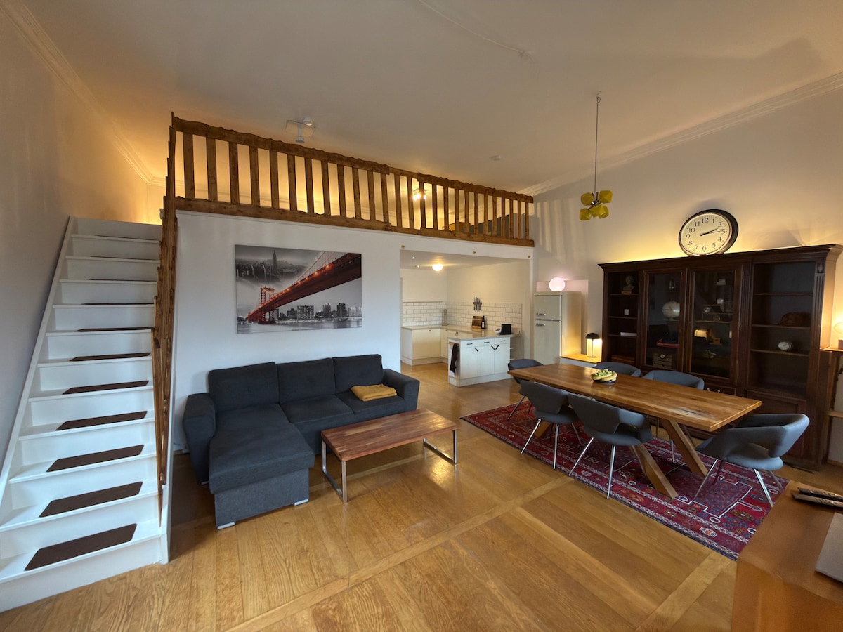 A casa está localizada a apenas 150 metros da estrada. A cobertura foi reformada por nós com muito carinho e transformada em sua selva urbana pessoal, com muitas plantas verdes. O apartamento está localizado no 5º andar, que pode ser acessado por um elevador e se estende por todo o sótão (85 metros quadrados) + 2 varandas separadas (parcialmente cobertas). Desfrute da vista panorâmica dos amplos balcones sem vizinhos adjacentes ou olhares indiscretos.